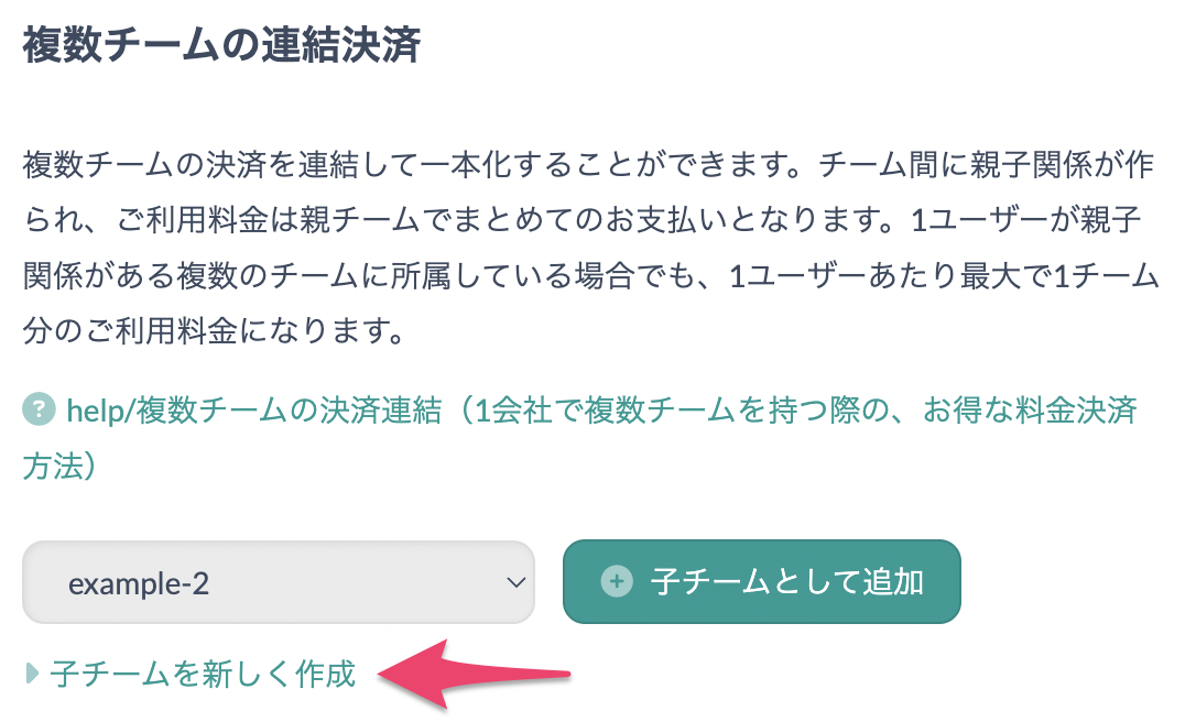 左側メニューの > 「SETTINGS」 > 「ご利用料金」 メニュー内にある 「複数チームの連結決済」 から、連結決済の子チームとしてチームを新しく作成できるようになりました。