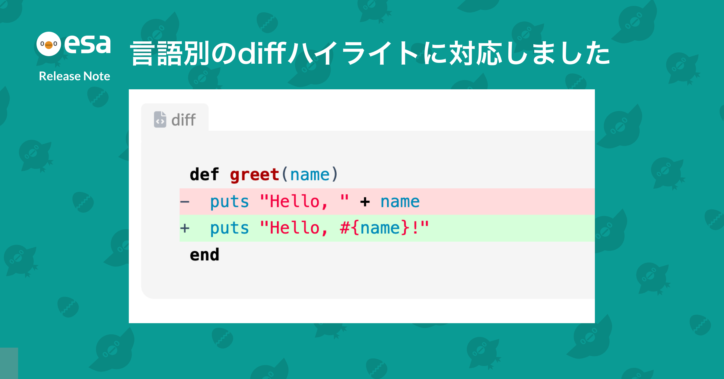コードブロックの言語指定に diff ruby や diff css のように diff 言語名を指定すると、diff マーカー(+/-) の色分けと 言語のシンタックスハイライト が同時に適用されるようになりました。